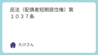 第二節 配偶者短期居住権(配偶者短期居住権)第千三十七条 配偶者は、被相続人の財産に属した建物に相続開始の時に無償で居住していた場合には、次の各号に掲げる区分に応じてそれぞれ当該各号に定める日までの間、その居住していた建物(以下この節におい...