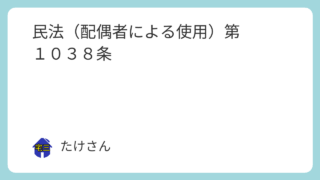 (配偶者による使用)第1038条 配偶者(配偶者短期居住権を有する配偶者に限る。以下この節において同じ。)は、従前の用法に従い、善良な管理者の注意をもって、居住建物の使用をしなければならない。2 配偶者は、居住建物取得者の承諾を得なければ、...