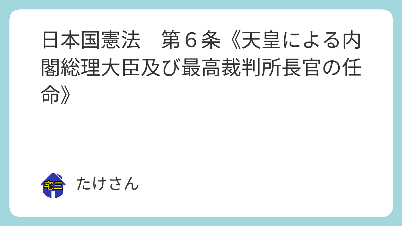 日本国憲法第6条 天皇は、国会の指名に基いて、内閣総理大臣を任命する。