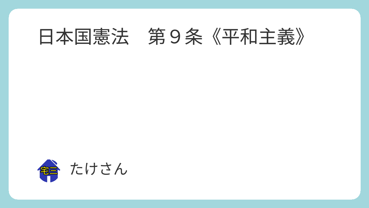 第9条 日本国民は、正義と秩序を基調とする国際平和を誠実に希求し、国権の発動たる戦争と、武力による威嚇又は武力の行使は、国際紛争を解決する手段としては、永久にこれを放棄する。
