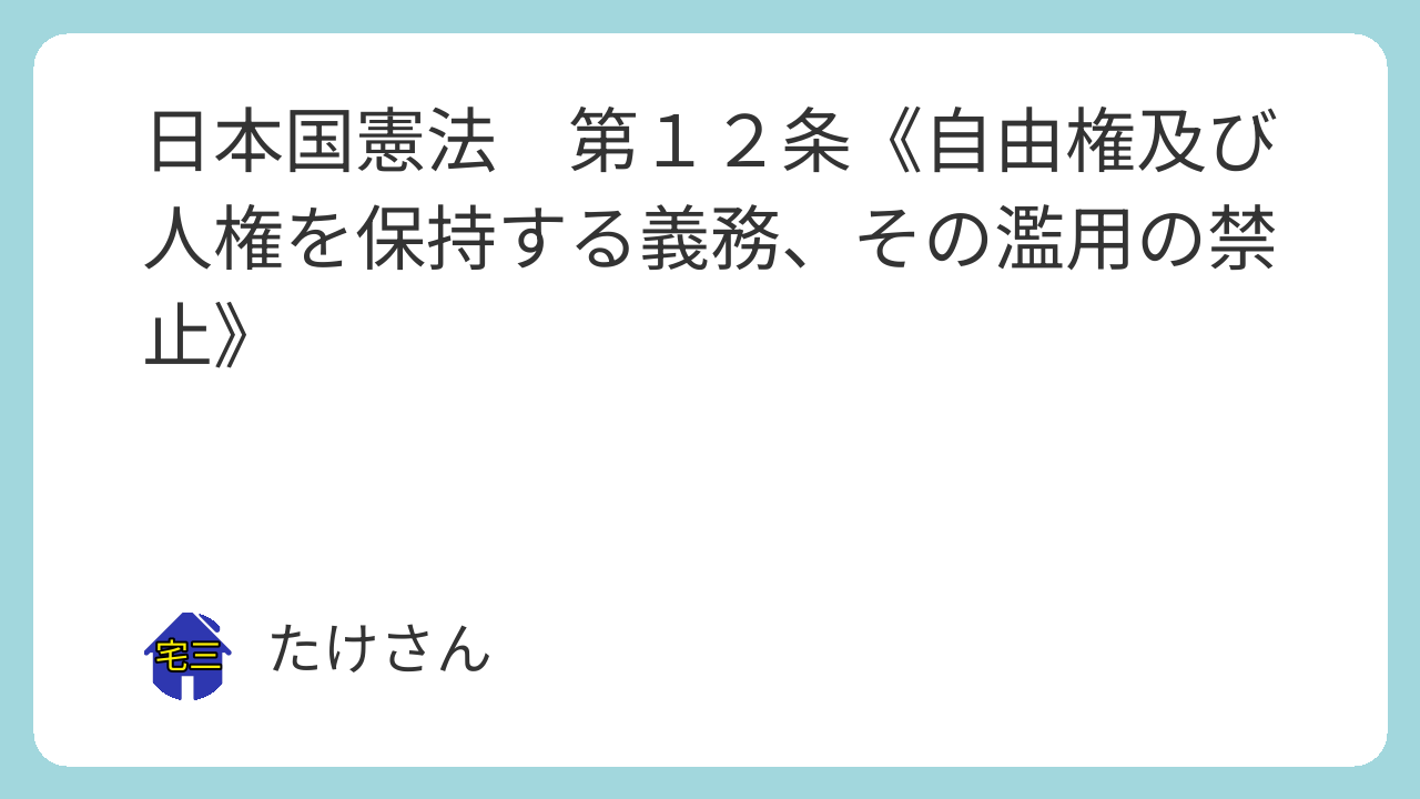 日本国憲法第12条 この憲法が国民に保障する自由及び権利は、国民の不断の努力によつて、これを保持しなければならない。又、国民は、これを濫用してはならないのであつて、常に公共の福祉のためにこれを利用する責任を負ふ。