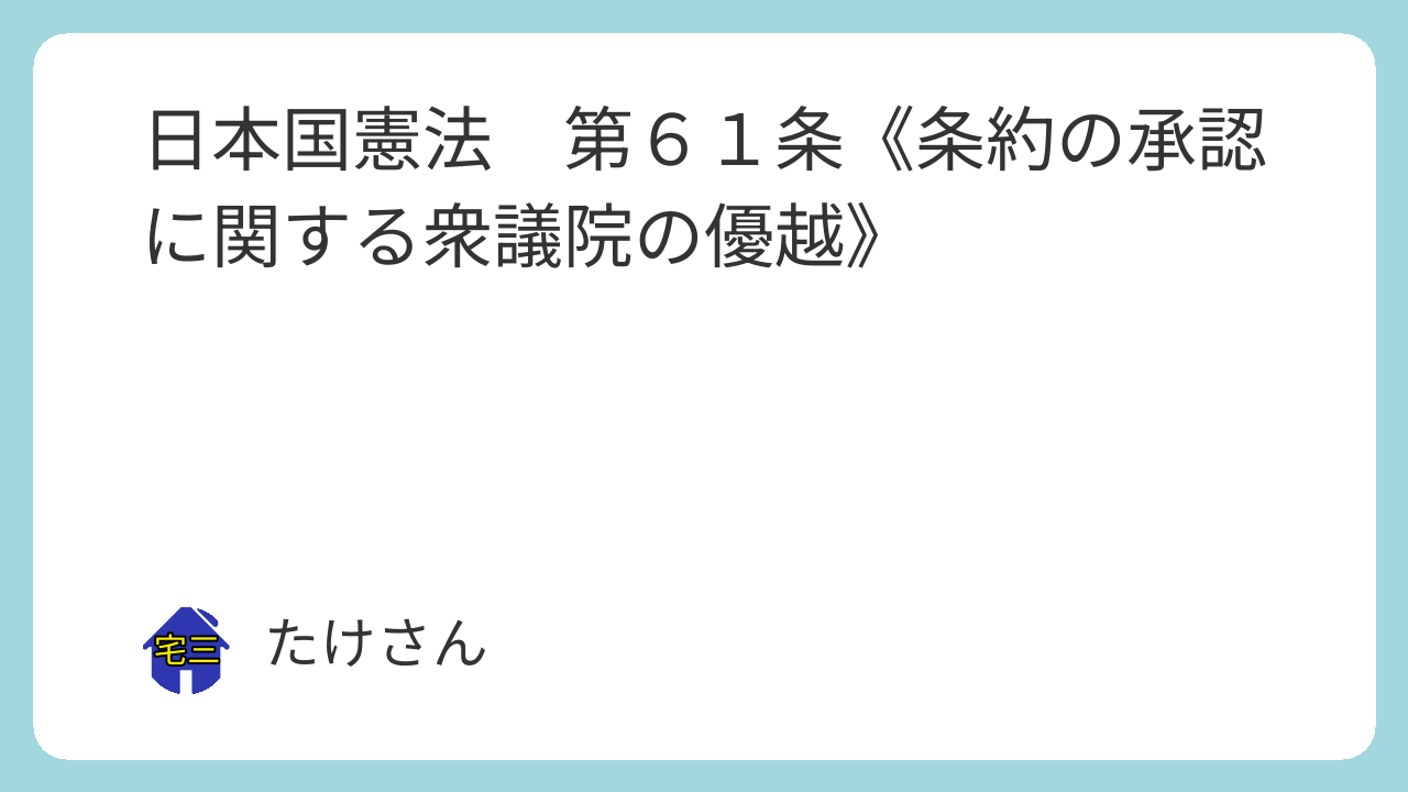 日本国憲法第61条 条約の締結に必要な国会の承認については、前条《第60条(衆議院の予算先議権、予算議決に関する衆議院の優越)》第2項の規定を準用する。