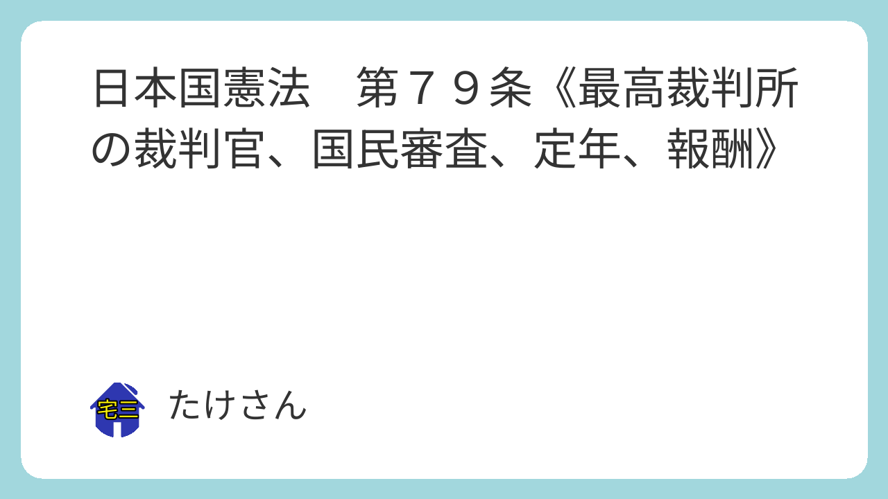 第79条 最高裁判所は、その長たる裁判官及び法律の定める員数のその他の裁判官でこれを構成し、その長たる裁判官以外の裁判官は、内閣でこれを任命する。