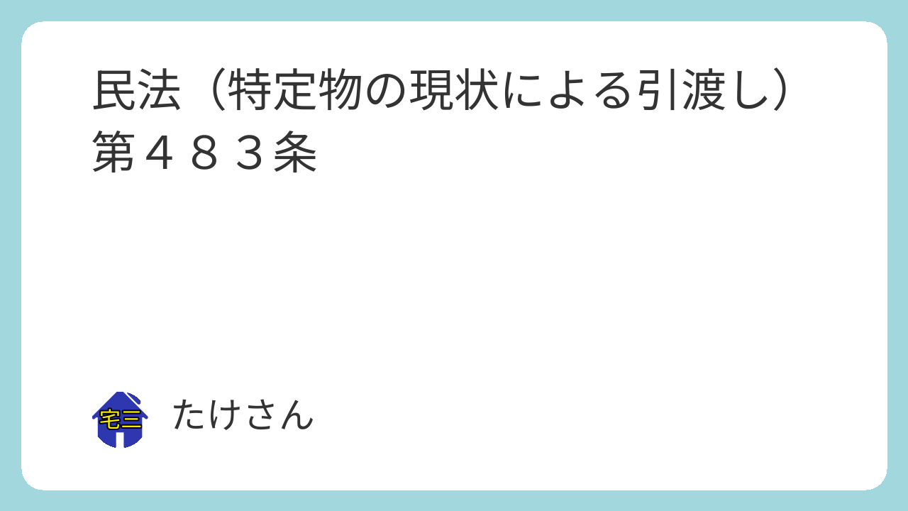第四百八十三条 債権の目的が特定物の引渡しである場合において、契約その他の債権の発生原因及び取引上の社会通念に照らしてその引渡しをすべき時の品質を定めることができないときは、弁済をする者は、その引渡しをすべき時の現状でその物を引き渡さなければならない。