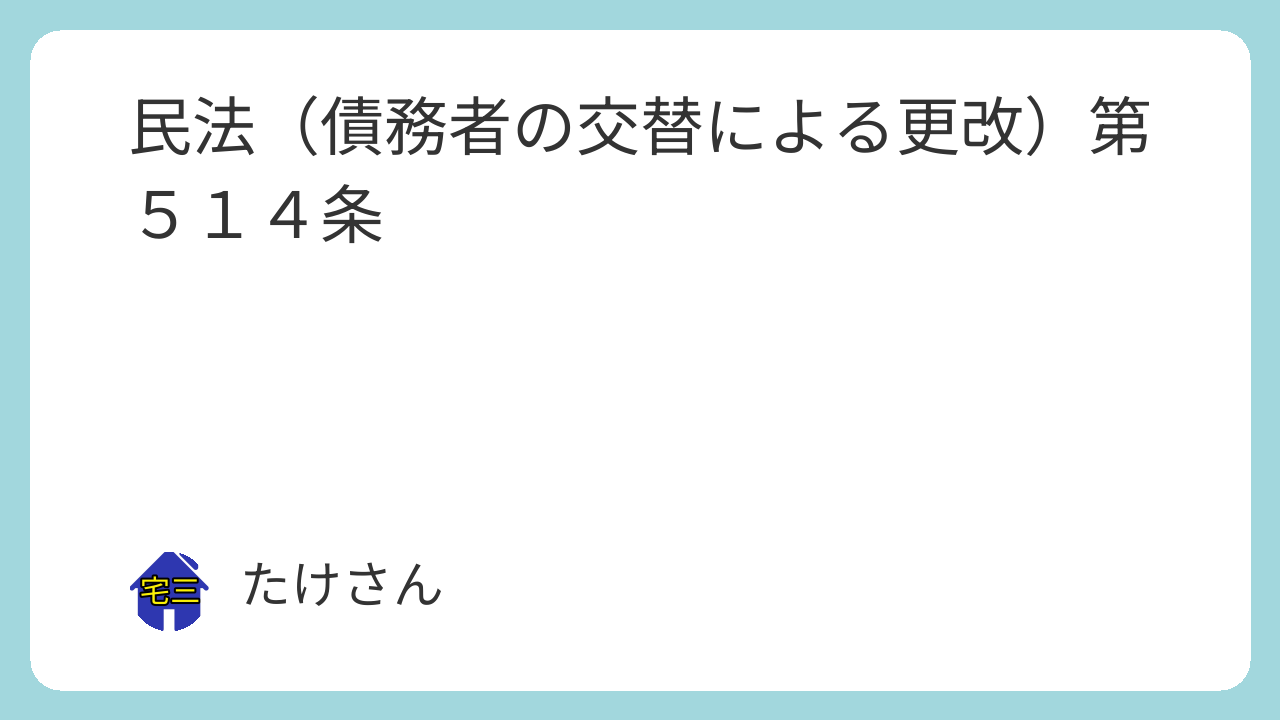第五百十四条 債務者の交替による更改は、債権者と更改後に債務者となる者との契約によってすることができる。この場合において、更改は、債権者が更改前の債務者に対してその契約をした旨を通知した時に、その効力を生ずる。