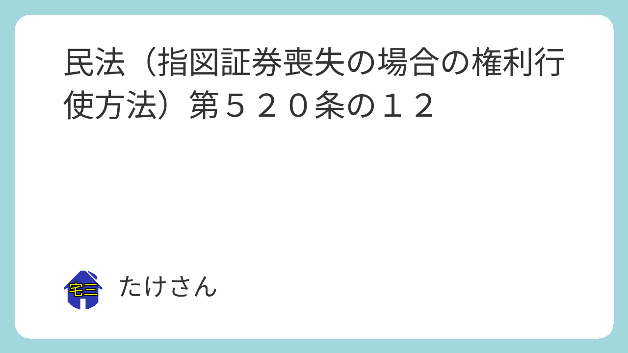 第五百二十条の十二 金銭その他の物又は有価証券の給付を目的とする指図証券の所持人がその指図証券を喪失した場合において、非訟事件手続法第百十四条に規定する公示催告の申立てをしたときは、その債務者に、その債務の目的物を供託させ、又は相当の担保を供してその指図証券の趣旨に従い履行をさせることができる。