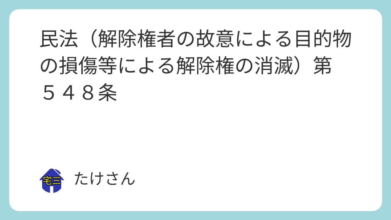 第五百四十八条 解除権を有する者が故意若しくは過失によって契約の目的物を著しく損傷し、若しくは返還することができなくなったとき、又は加工若しくは改造によってこれを他の種類の物に変えたときは、解除権は、消滅する。ただし、解除権を有する者がその解除権を有することを知らなかったときは、この限りでない。