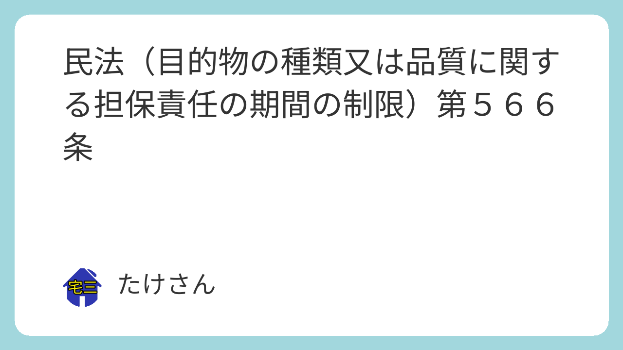第五百六十六条 売主が種類又は品質に関して契約の内容に適合しない目的物を買主に引き渡した場合において、買主がその不適合を知った時から一年以内にその旨を売主に通知しないときは、買主は、その不適合を理由として、履行の追完の請求、代金の減額の請求、損害賠償の請求及び契約の解除をすることができない。ただし、売主が引渡しの時にその不適合を知り、又は重大な過失によって知らなかったときは、この限りでない。