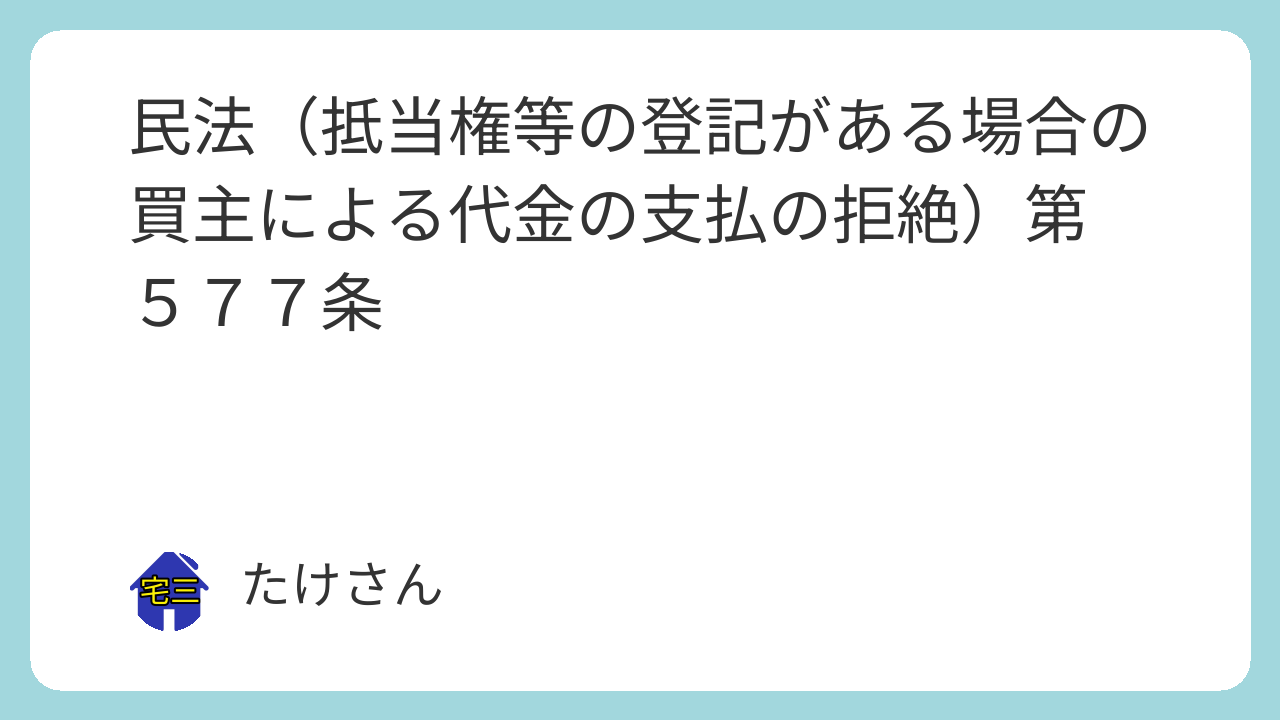 第五百七十七条 買い受けた不動産について契約の内容に適合しない抵当権の登記があるときは、買主は、抵当権消滅請求の手続が終わるまで、その代金の支払を拒むことができる。この場合において、売主は、買主に対し、遅滞なく抵当権消滅請求をすべき旨を請求することができる。