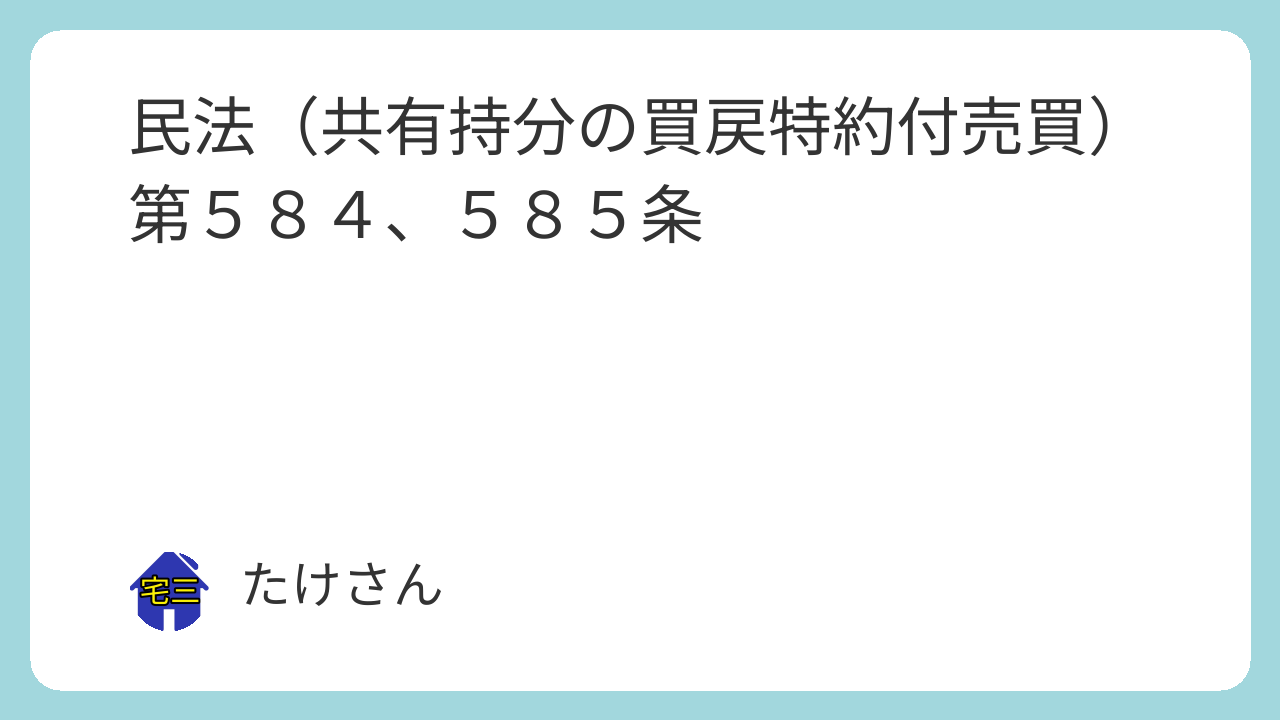 第五百八十四条 不動産の共有者の一人が買戻しの特約を付してその持分を売却した後に、その不動産の分割又は競売があったときは、売主は、買主が受け、若しくは受けるべき部分又は代金について、買戻しをすることができる。ただし、売主に通知をしないでした分割及び競売は、売主に対抗することができない。