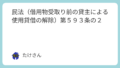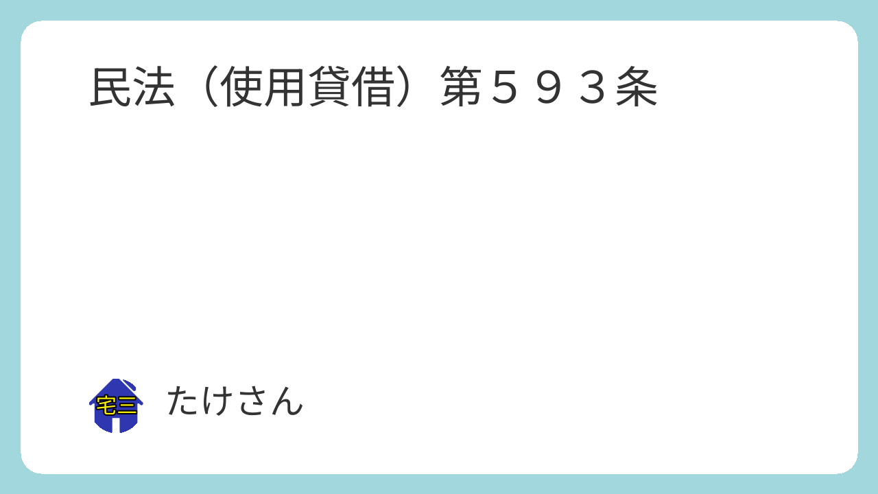 第五百九十三条 使用貸借は、当事者の一方がある物を引き渡すことを約し、相手方がその受け取った物について無償で使用及び収益をして契約が終了したときに返還をすることを約することによって、その効力を生ずる。