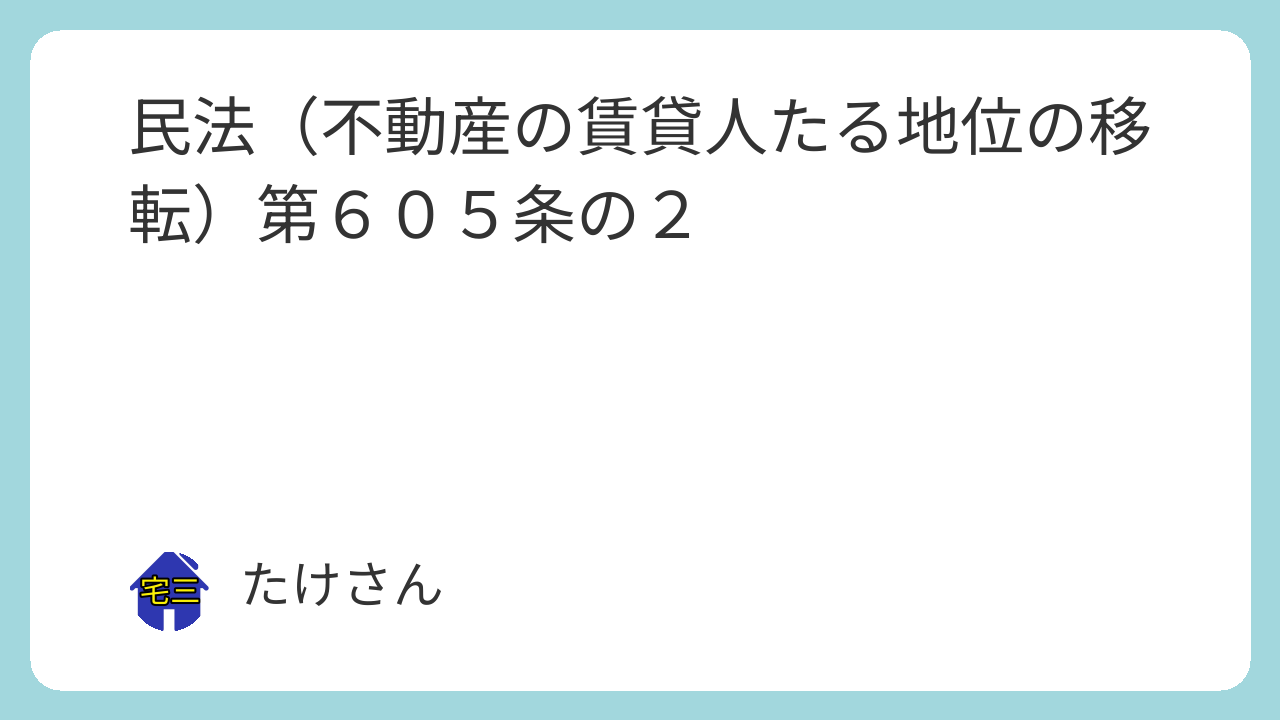 第六百五条の二 前条、借地借家法(平成三年法律第九十号)第十条又は第三十一条その他の法令の規定による賃貸借の対抗要件を備えた場合において、その不動産が譲渡されたときは、その不動産の賃貸人たる地位は、その譲受人に移転する。