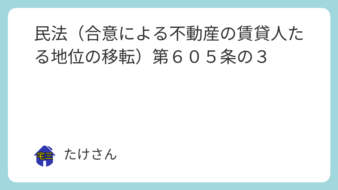 第六百五条の三 不動産の譲渡人が賃貸人であるときは、その賃貸人たる地位は、賃借人の承諾を要しないで、譲渡人と譲受人との合意により、譲受人に移転させることができる。この場合においては、前条第三項及び第四項の規定を準用する。
