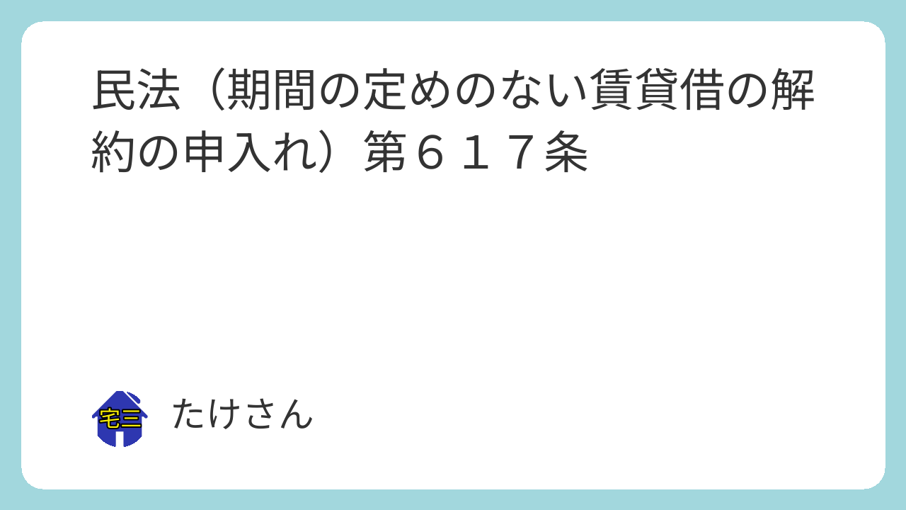 第六百十七条 当事者が賃貸借の期間を定めなかったときは、各当事者は、いつでも解約の申入れをすることができる。この場合においては、次の各号に掲げる賃貸借は、解約の申入れの日からそれぞれ当該各号に定める期間を経過することによって終了する。
