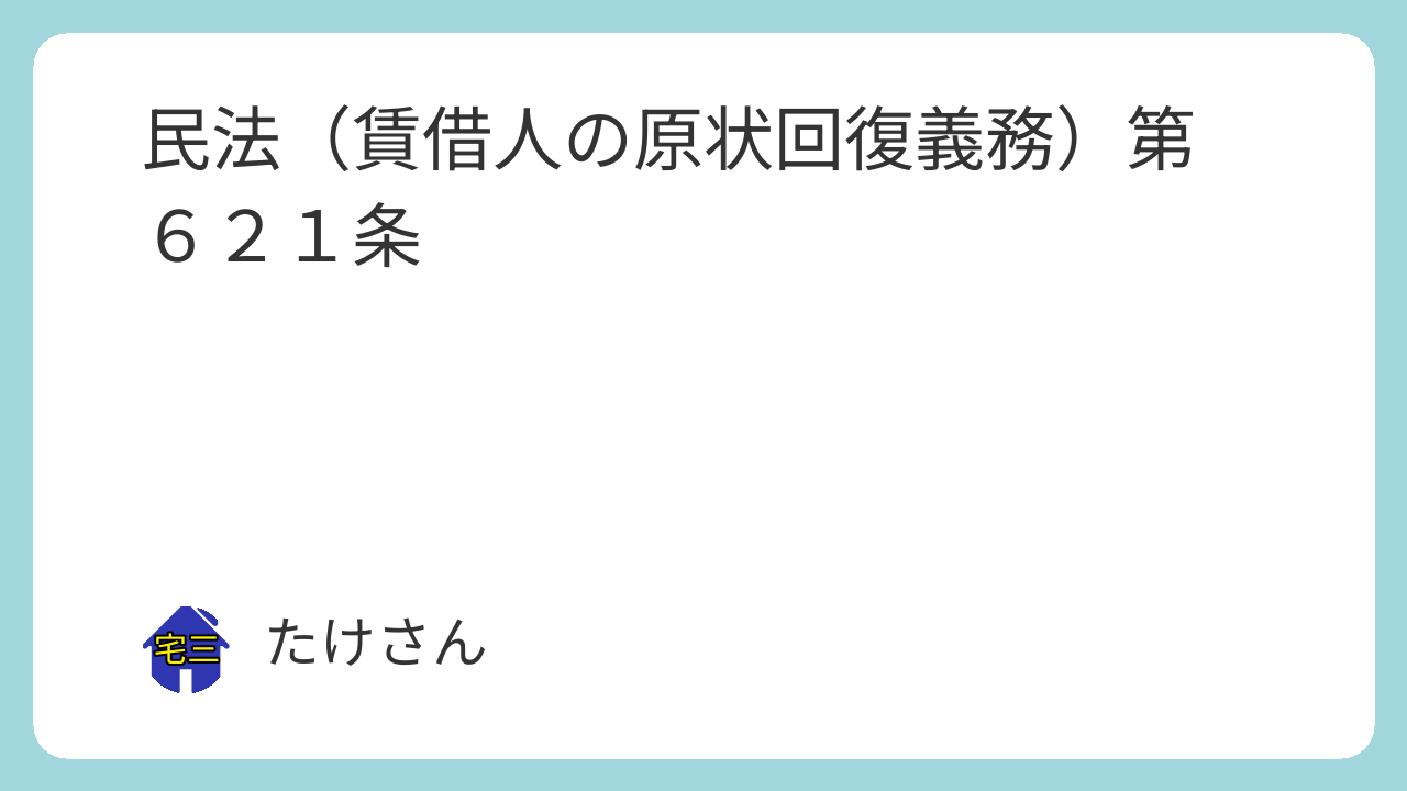 第六百二十一条 賃借人は、賃借物を受け取った後にこれに生じた損傷(通常の使用及び収益によって生じた賃借物の損耗並びに賃借物の経年変化を除く。以下この条において同じ。)がある場合において、賃貸借が終了したときは、その損傷を原状に復する義務を負う。ただし、その損傷が賃借人の責めに帰することができない事由によるものであるときは、この限りでない。