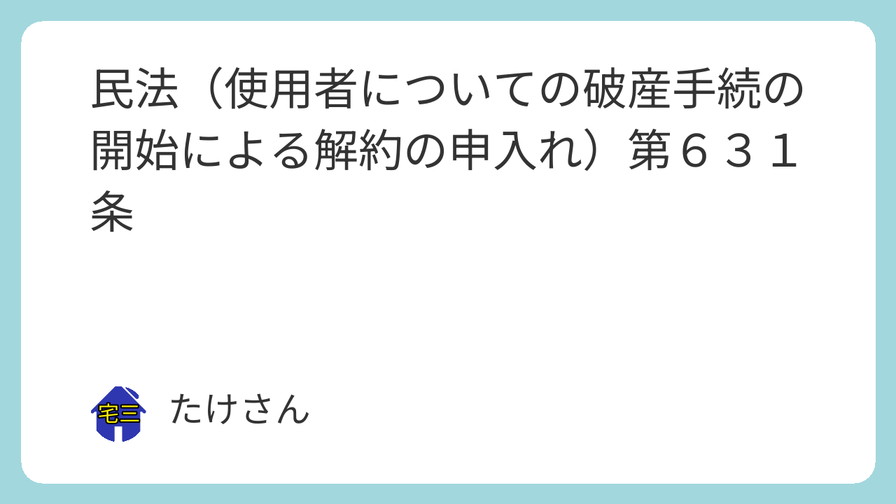 第六百三十一条 使用者が破産手続開始の決定を受けた場合には、雇用に期間の定めがあるときであっても、労働者又は破産管財人は、第六百二十七条の規定により解約の申入れをすることができる。この場合において、各当事者は、相手方に対し、解約によって生じた損害の賠償を請求することができない。