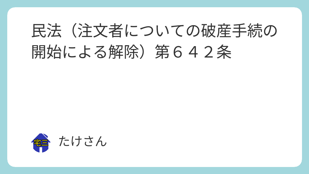 第六百四十二条 注文者が破産手続開始の決定を受けたときは、請負人又は破産管財人は、契約の解除をすることができる。ただし、請負人による契約の解除については、仕事を完成した後は、この限りでない。