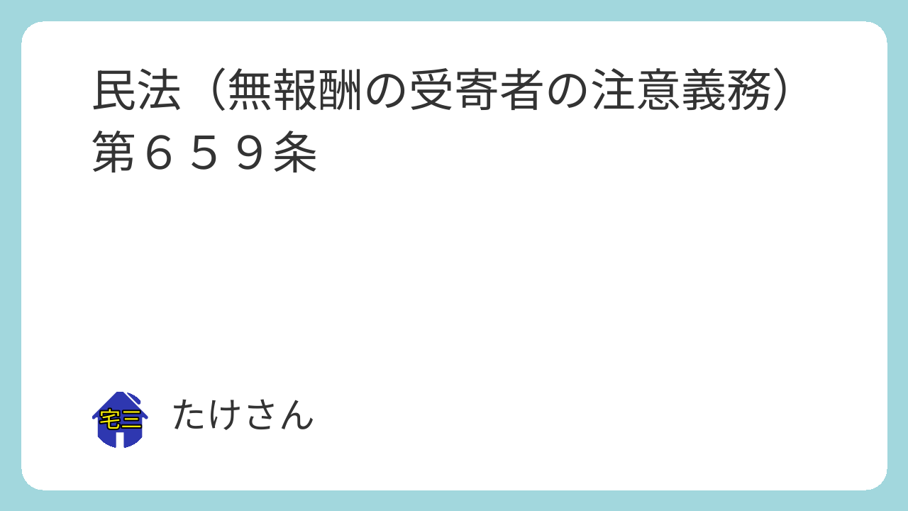 第六百五十九条 無報酬の受寄者は、自己の財産に対するのと同一の注意をもって、寄託物を保管する義務を負う。