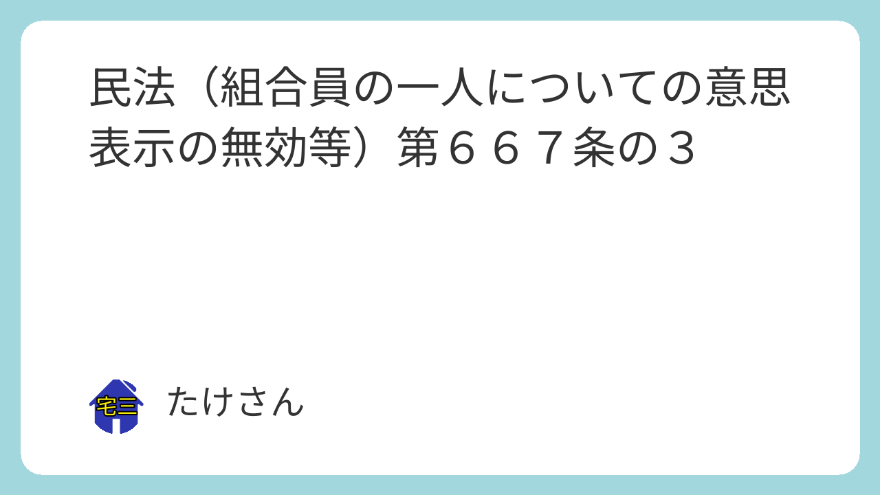 第六百六十七条の三 組合員の一人について意思表示の無効又は取消しの原因があっても、他の組合員の間においては、組合契約は、その効力を妨げられない。