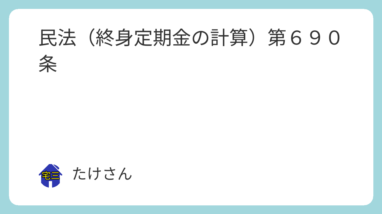 民法(終身定期金の計算)第690条 民法 X Facebook はてブ LINE コピー 2025.09.19 この記事は約1分で読めます。 (終身定期金の計算)第六百九十条 終身定期金は、日割りで計算する。 民法 令和6年5月24日 施行https://laws.e-gov.go.jp/law/129AC0000000089/20240524_506AC0000000033