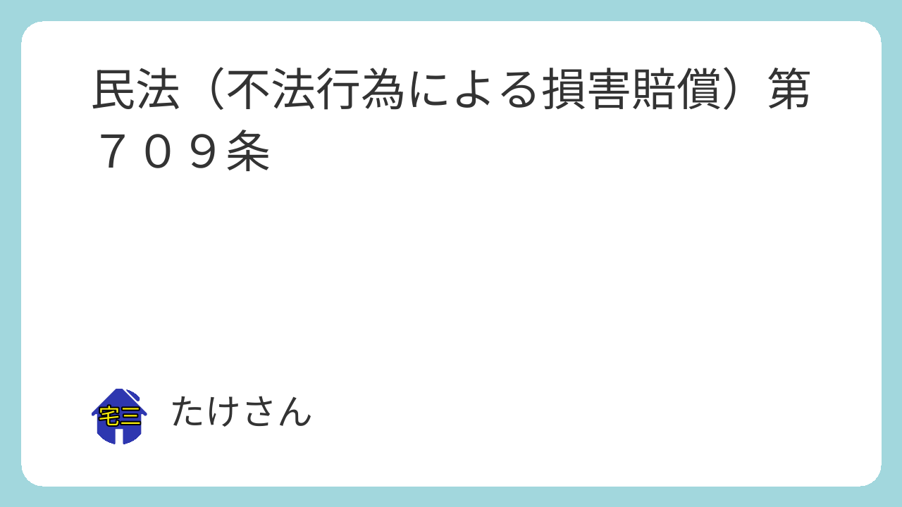 第七百九条 故意又は過失によって他人の権利又は法律上保護される利益を侵害した者は、これによって生じた損害を賠償する責任を負う。