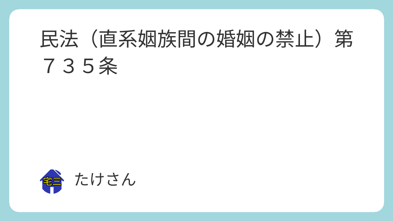 第七百三十五条 直系姻族の間では、婚姻をすることができない。第七百二十八条又は第八百十七条の九の規定により姻族関係が終了した後も、同様とする。
