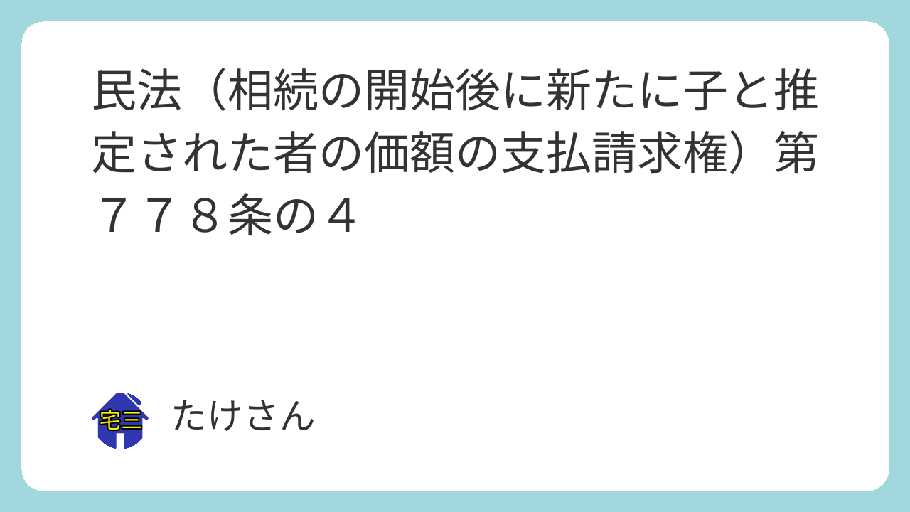 第七百七十八条の四 相続の開始後、第七百七十四条の規定により否認権が行使され、第七百七十二条第四項の規定により読み替えられた同条第三項の規定により新たに被相続人がその父と定められた者が相続人として遺産の分割を請求しようとする場合において、他の共同相続人が既にその分割その他の処分をしていたときは、当該相続人の遺産分割の請求は、価額のみによる支払の請求により行うものとする。