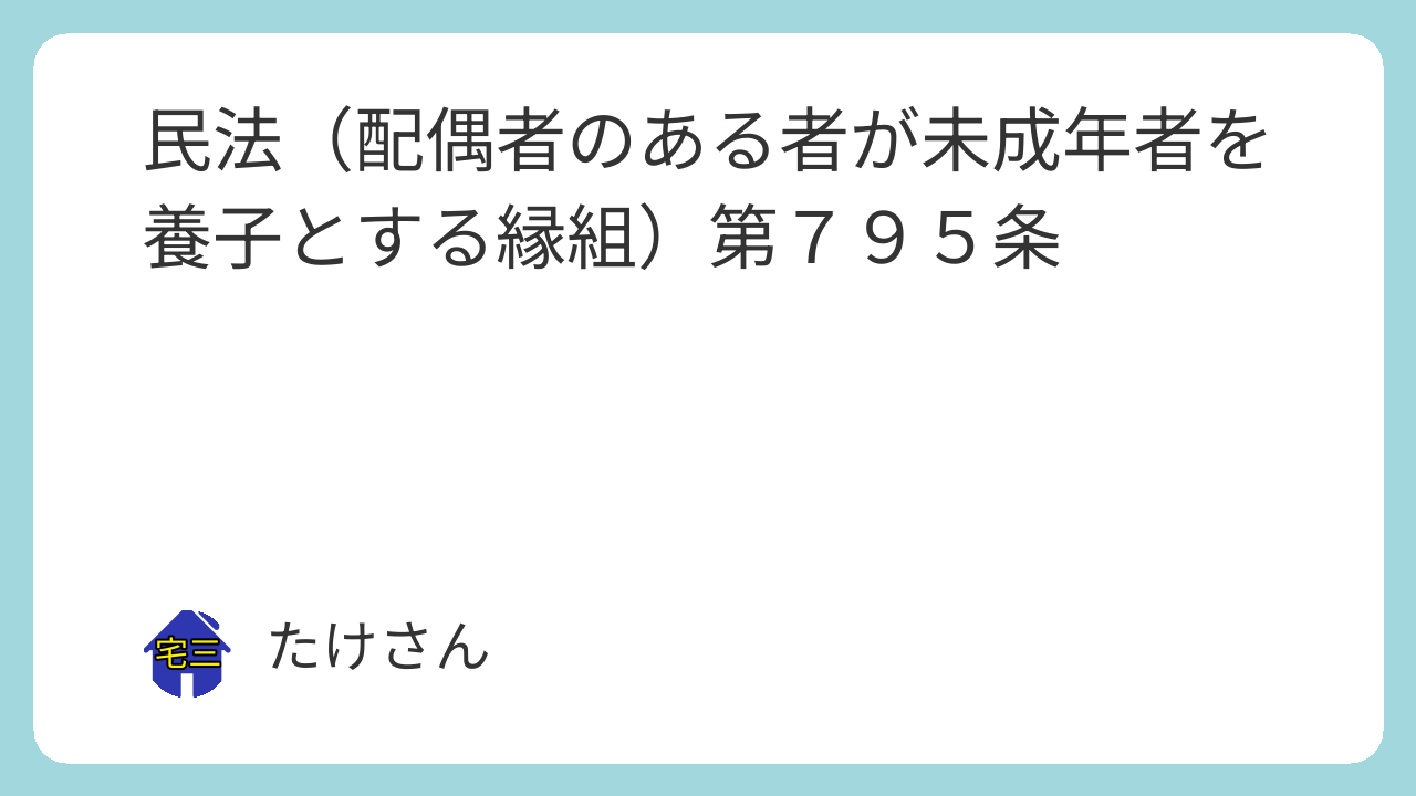 第七百九十五条 配偶者のある者が未成年者を養子とするには、配偶者とともにしなければならない。ただし、配偶者の嫡出である子を養子とする場合又は配偶者がその意思を表示することができない場合は、この限りでない。