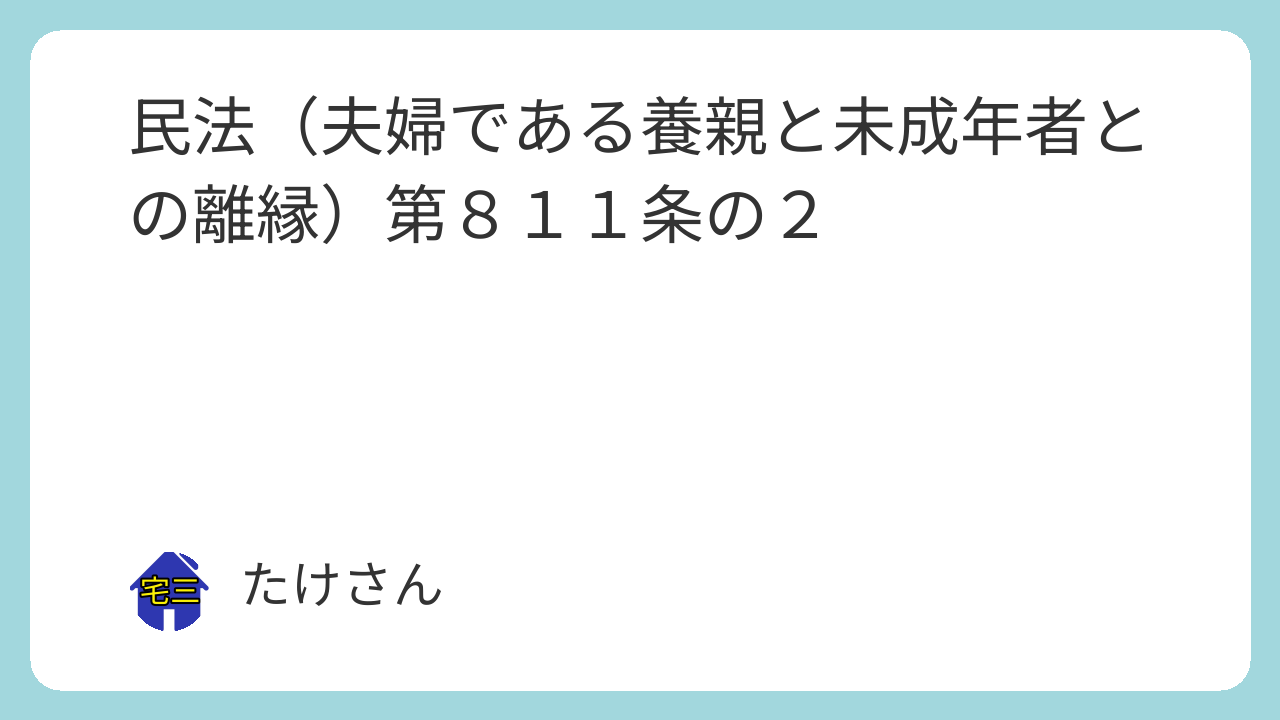 第八百十一条の二 養親が夫婦である場合において未成年者と離縁をするには、夫婦が共にしなければならない。ただし、夫婦の一方がその意思を表示することができないときは、この限りでない。