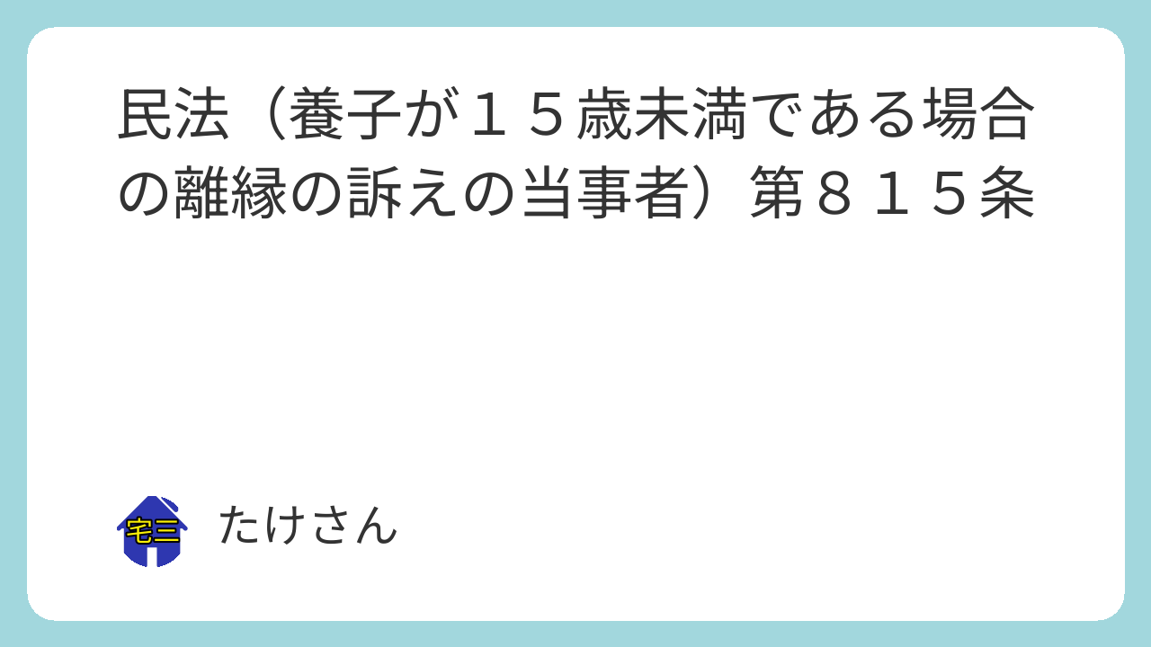 第815条 養子が15歳に達しない間は、第811条の規定により養親と離縁の協議をすることができる者から、又はこれに対して、離縁の訴えを提起することができる。