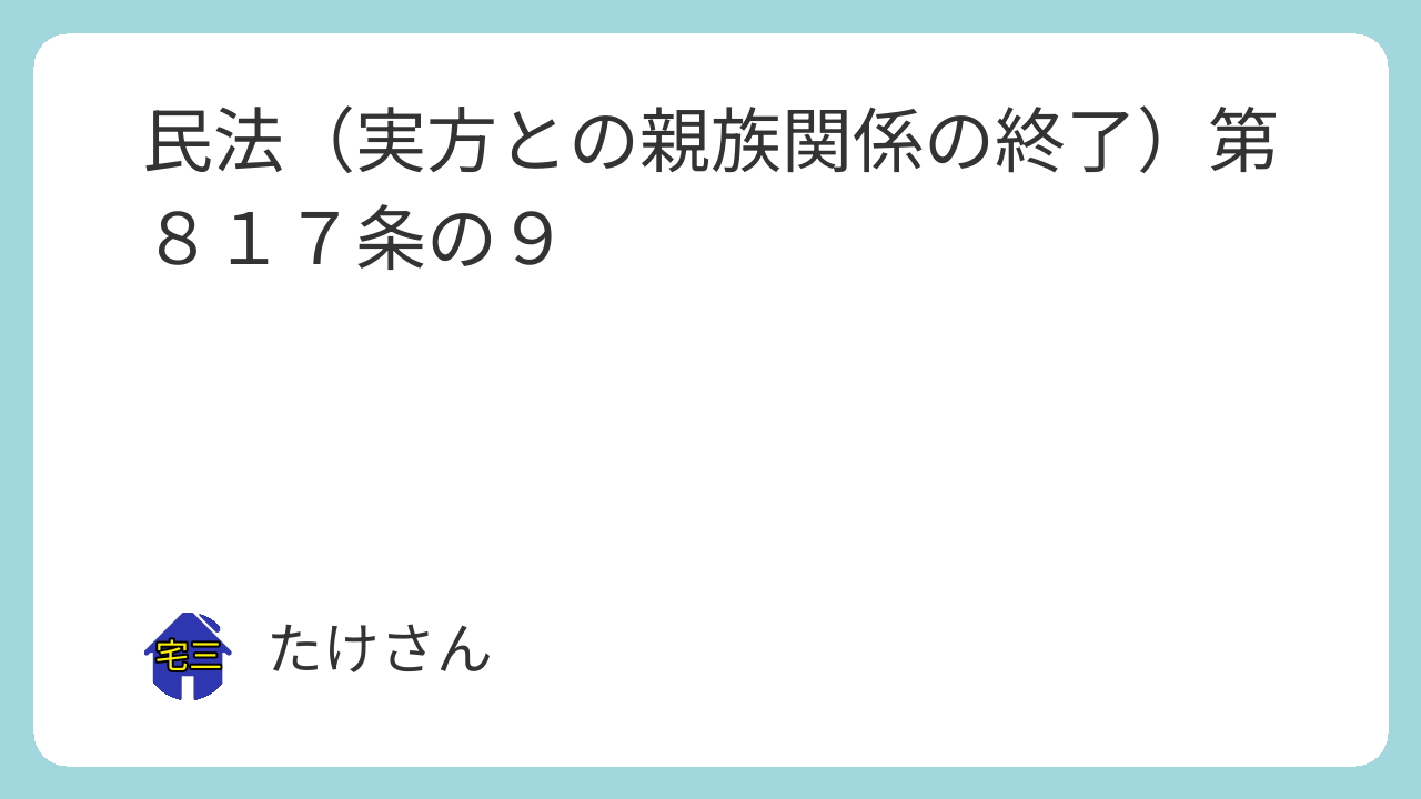 第八百十七条の九 養子と実方の父母及びその血族との親族関係は、特別養子縁組によって終了する。ただし、第八百十七条の三第二項ただし書に規定する他の一方及びその血族との親族関係については、この限りでない。