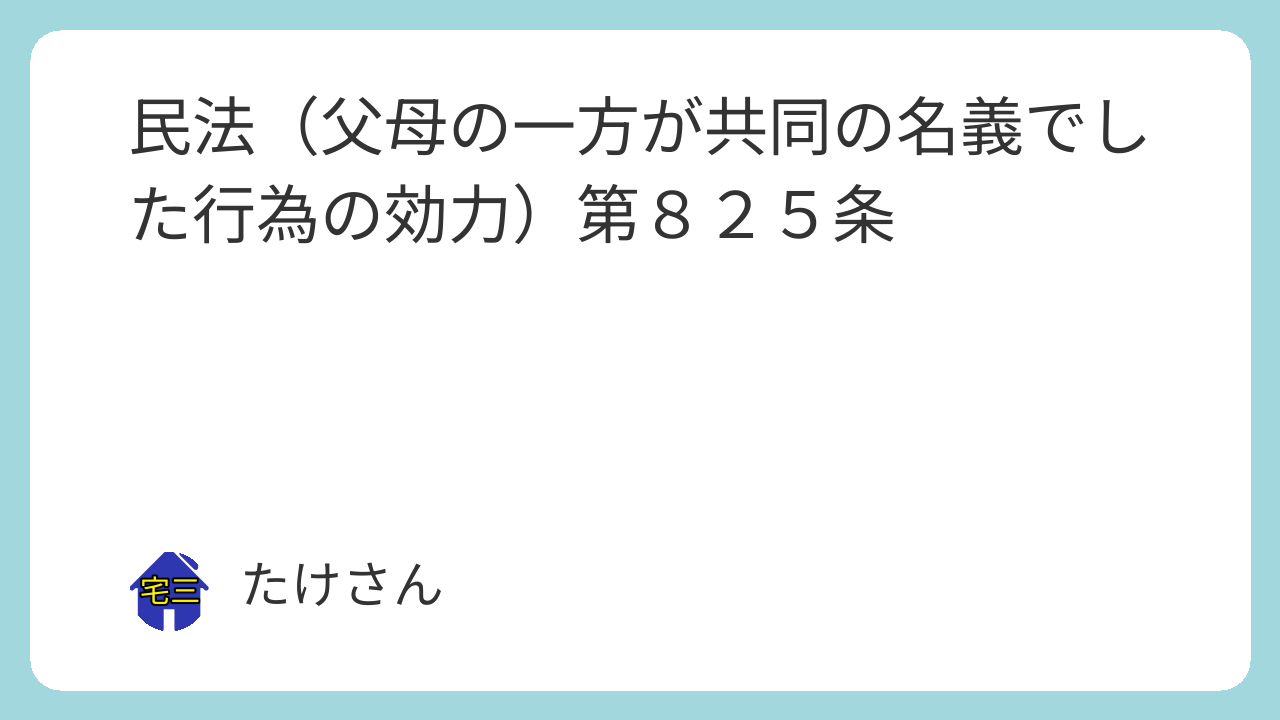 第八百二十五条 父母が共同して親権を行う場合において、父母の一方が、共同の名義で、子に代わって法律行為をし又は子がこれをすることに同意したときは、その行為は、他の一方の意思に反したときであっても、そのためにその効力を妨げられない。ただし、相手方が悪意であったときは、この限りでない。