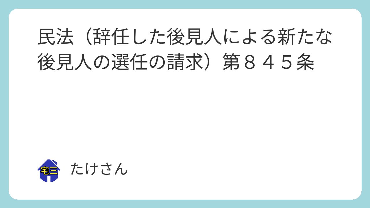 第845条 後見人がその任務を辞したことによって新たに後見人を選任する必要が生じたときは、その後見人は、遅滞なく新たな後見人の選任を家庭裁判所に請求しなければならない。