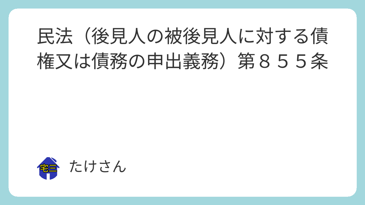 第八百五十五条 後見人が、被後見人に対し、債権を有し、又は債務を負う場合において、後見監督人があるときは、財産の調査に着手する前に、これを後見監督人に申し出なければならない。
