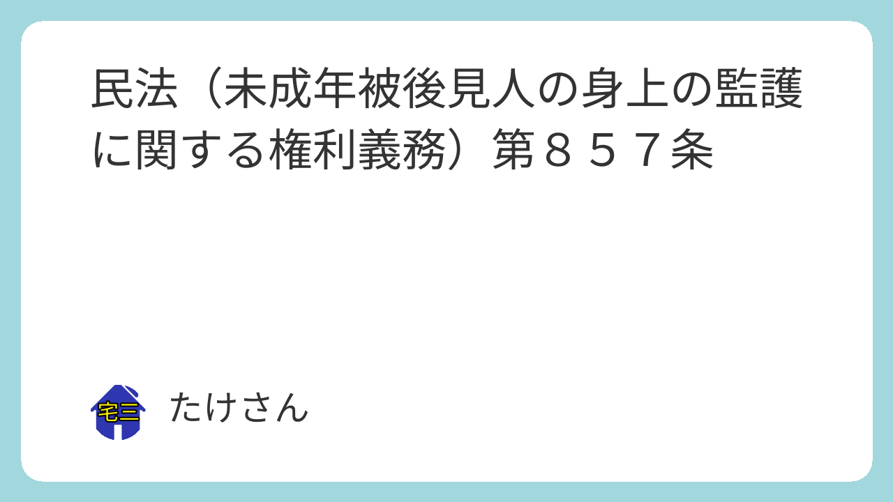 第八百五十七条 未成年後見人は、第八百二十条から第八百二十三条までに規定する事項について、親権を行う者と同一の権利義務を有する。ただし、親権を行う者が定めた教育の方法及び居所を変更し、営業を許可し、その許可を取り消し、又はこれを制限するには、未成年後見監督人があるときは、その同意を得なければならない。