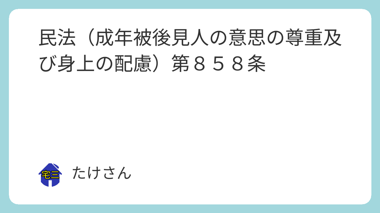 第八百五十八条 成年後見人は、成年被後見人の生活、療養看護及び財産の管理に関する事務を行うに当たっては、成年被後見人の意思を尊重し、かつ、その心身の状態及び生活の状況に配慮しなければならない。