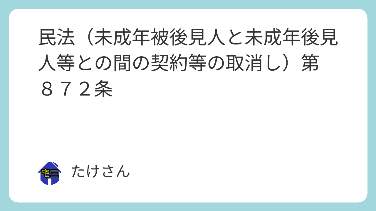 第872条 未成年被後見人が成年に達した後後見の計算の終了前に、その者と未成年後見人又はその相続人との間でした契約は、その者が取り消すことができる。その者が未成年後見人又はその相続人に対してした単独行為も、同様とする。
