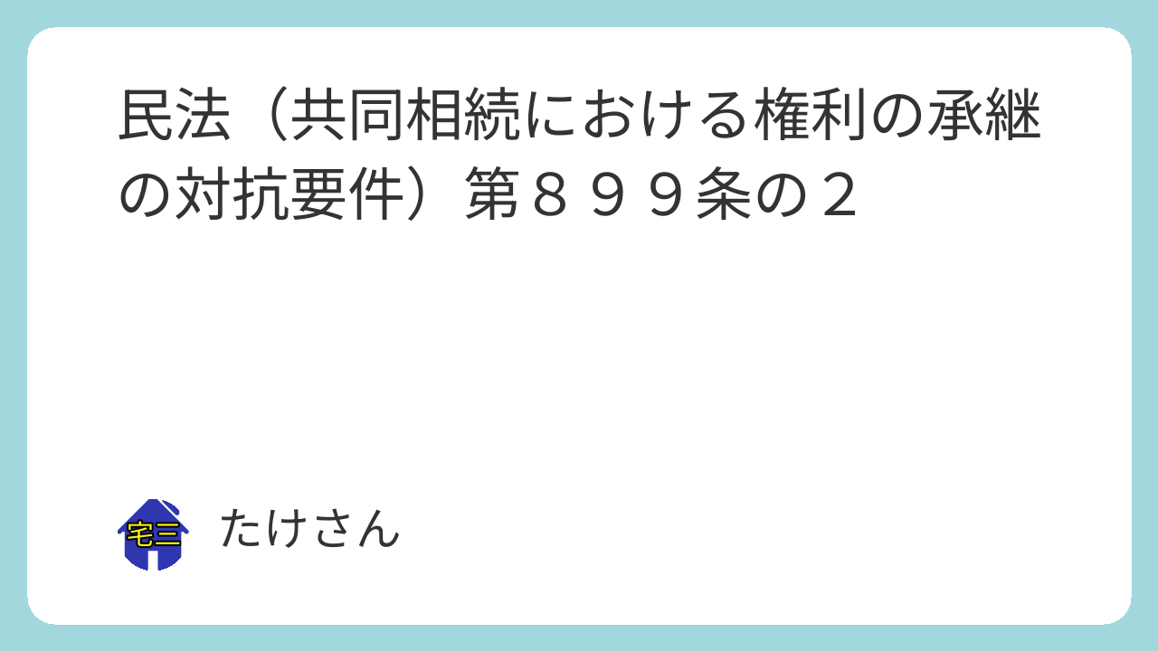 第899条の2 相続による権利の承継は、遺産の分割によるものかどうかにかかわらず、次条《第900条(法定相続分)》及び第901条(代襲相続人の相続分)の規定により算定した相続分を超える部分については、登記、登録その他の対抗要件を備えなければ、第三者に対抗することができない。