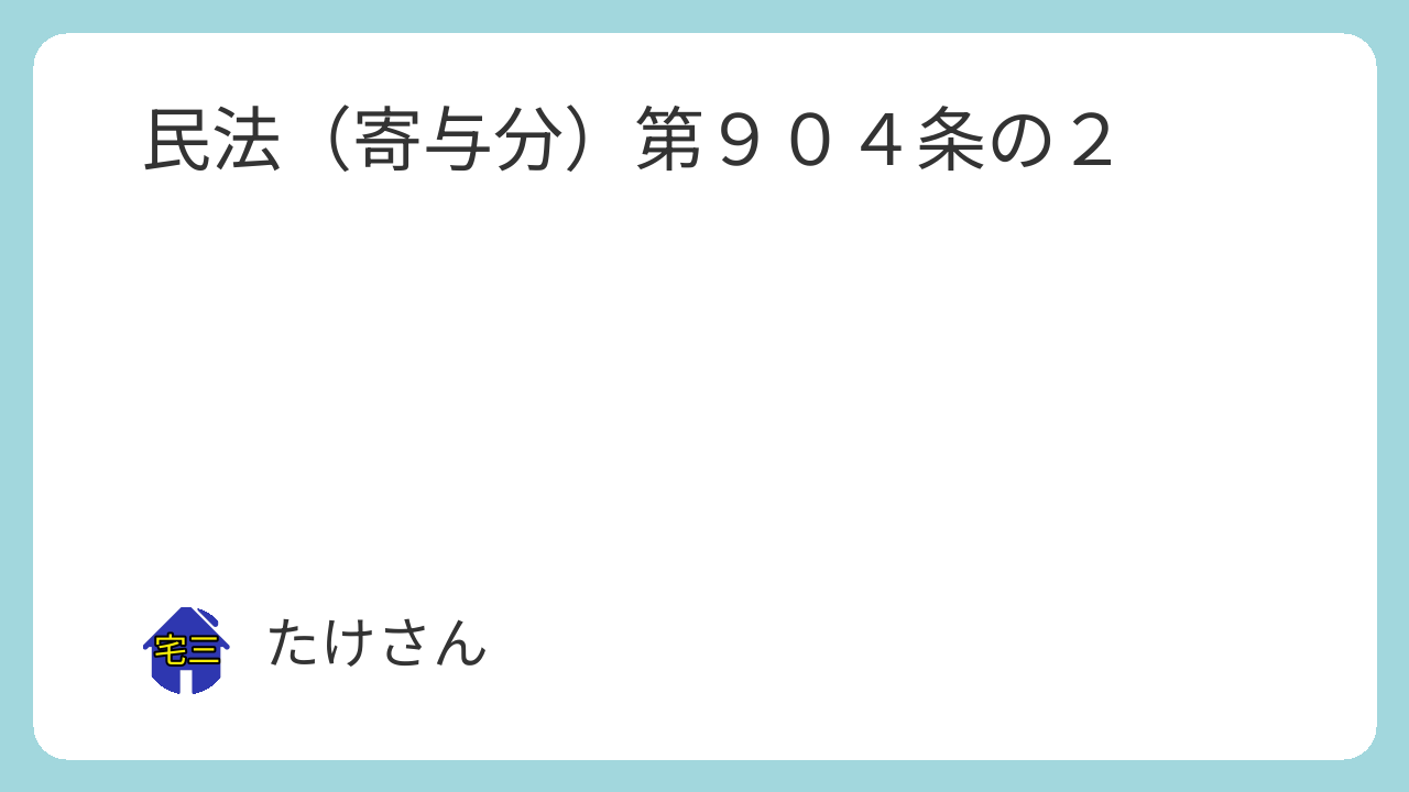 第九百四条の二 共同相続人中に、被相続人の事業に関する労務の提供又は財産上の給付、被相続人の療養看護その他の方法により被相続人の財産の維持又は増加について特別の寄与をした者があるときは、被相続人が相続開始の時において有した財産の価額から共同相続人の協議で定めたその者の寄与分を控除したものを相続財産とみなし、第九百条から第九百二条までの規定により算定した相続分に寄与分を加えた額をもってその者の相続分とする。