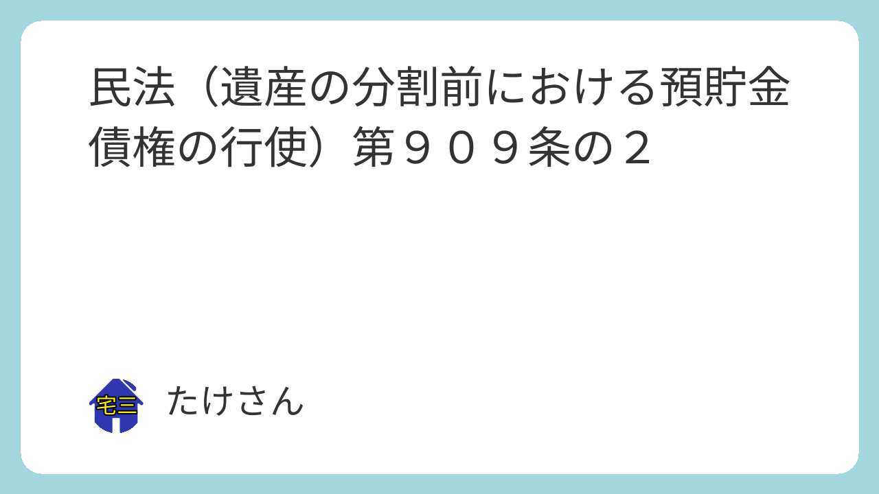 第九百九条の二 各共同相続人は、遺産に属する預貯金債権のうち相続開始の時の債権額の三分の一に第九百条及び第九百一条の規定により算定した当該共同相続人の相続分を乗じた額(標準的な当面の必要生計費、平均的な葬式の費用の額その他の事情を勘案して預貯金債権の債務者ごとに法務省令で定める額を限度とする。)については、単独でその権利を行使することができる。この場合において、当該権利の行使をした預貯金債権については、当該共同相続人が遺産の一部の分割によりこれを取得したものとみなす。