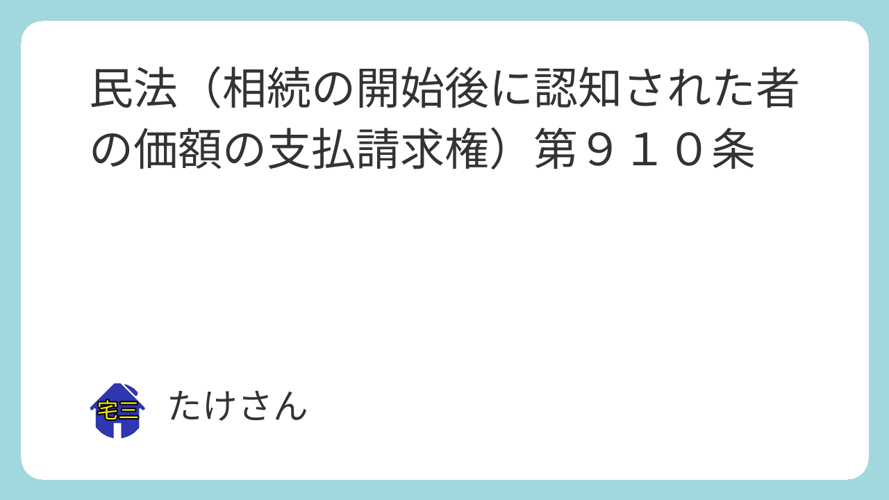第九百十条 相続の開始後認知によって相続人となった者が遺産の分割を請求しようとする場合において、他の共同相続人が既にその分割その他の処分をしたときは、価額のみによる支払の請求権を有する。