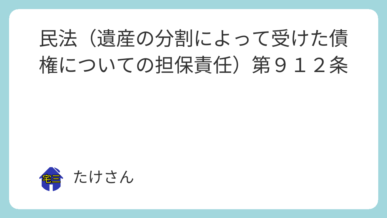 第九百十二条 各共同相続人は、その相続分に応じ、他の共同相続人が遺産の分割によって受けた債権について、その分割の時における債務者の資力を担保する。