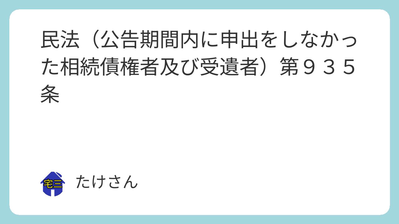 第九百三十五条 第九百二十七条第一項の期間内に同項の申出をしなかった相続債権者及び受遺者で限定承認者に知れなかったものは、残余財産についてのみその権利を行使することができる。ただし、相続財産について特別担保を有する者は、この限りでない。