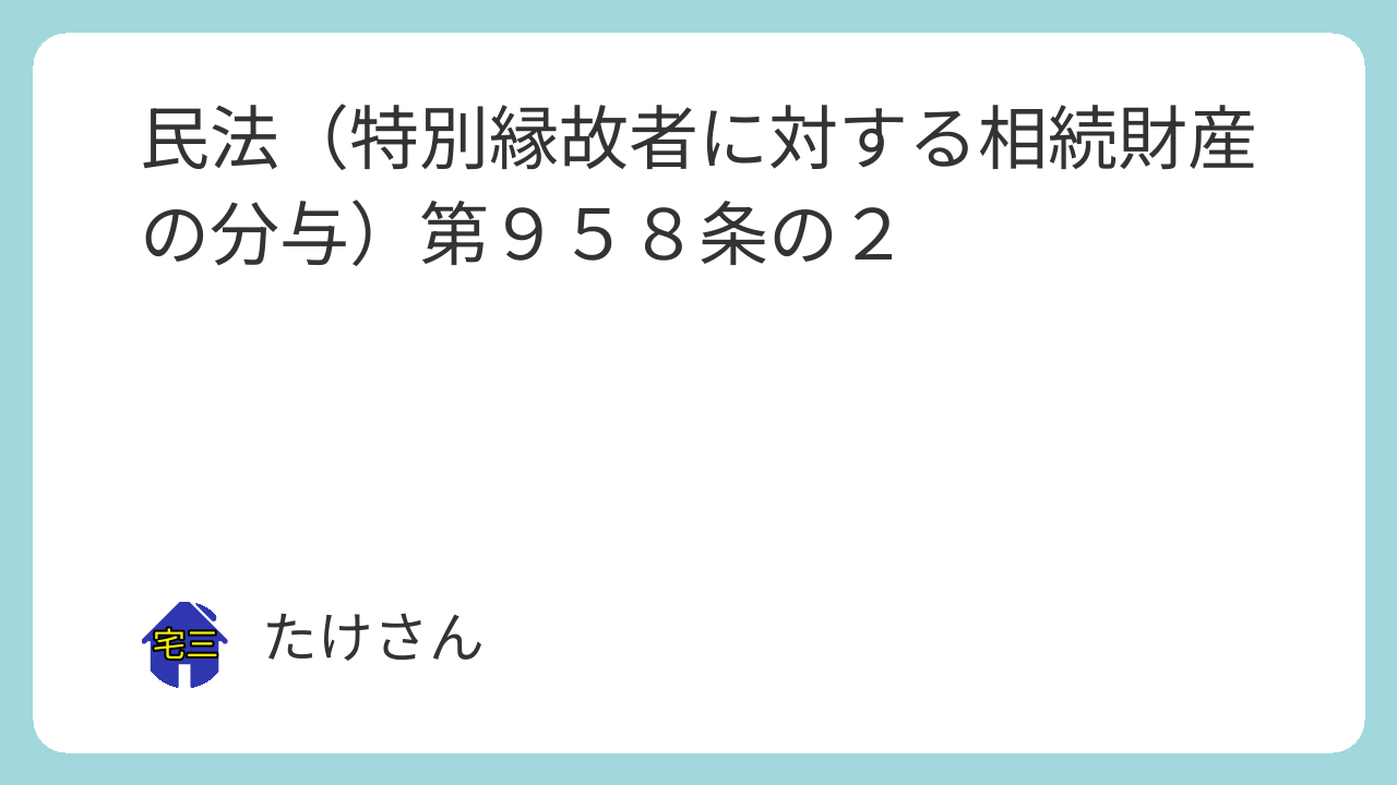 第九百五十八条の二 前条の場合において、相当と認めるときは、家庭裁判所は、被相続人と生計を同じくしていた者、被相続人の療養看護に努めた者その他被相続人と特別の縁故があった者の請求によって、これらの者に、清算後残存すべき相続財産の全部又は一部を与えることができる。