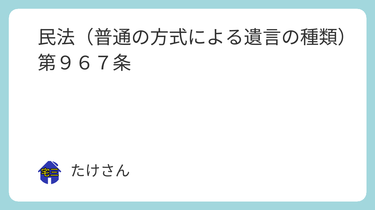 第九百六十七条 遺言は、自筆証書、公正証書又は秘密証書によってしなければならない。ただし、特別の方式によることを許す場合は、この限りでない。