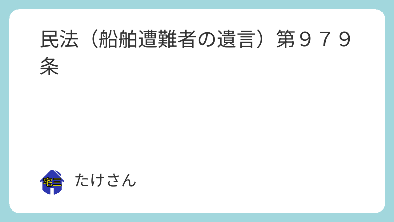 第九百七十九条 船舶が遭難した場合において、当該船舶中に在って死亡の危急に迫った者は、証人二人以上の立会いをもって口頭で遺言をすることができる。