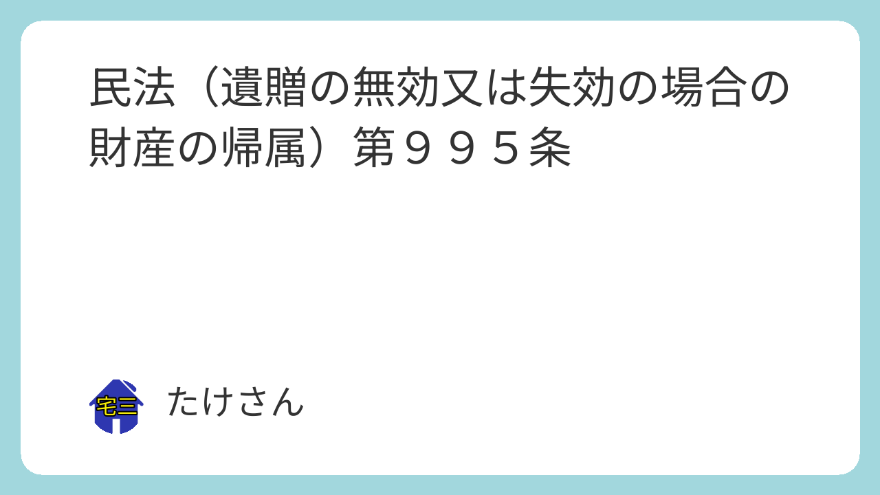 第九百九十五条 遺贈が、その効力を生じないとき、又は放棄によってその効力を失ったときは、受遺者が受けるべきであったものは、相続人に帰属する。ただし、遺言者がその遺言に別段の意思を表示したときは、その意思に従う。