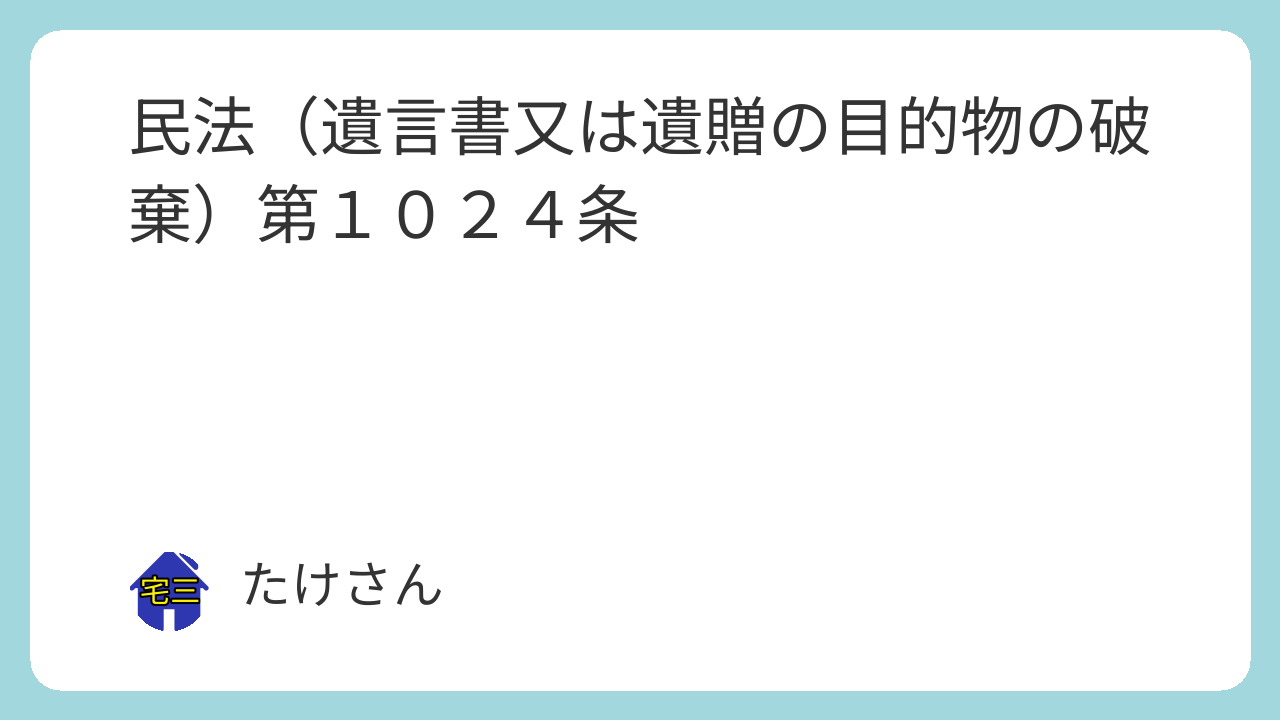第千二十四条 遺言者が故意に遺言書を破棄したときは、その破棄した部分については、遺言を撤回したものとみなす。遺言者が故意に遺贈の目的物を破棄したときも、同様とする。