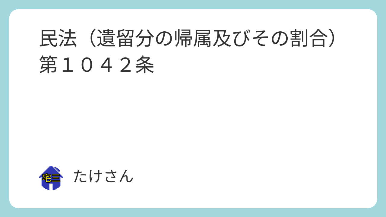 第千四十二条 兄弟姉妹以外の相続人は、遺留分として、次条第一項に規定する遺留分を算定するための財産の価額に、次の各号に掲げる区分に応じてそれぞれ当該各号に定める割合を乗じた額を受ける。