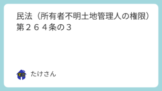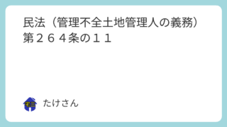 民法 民法(管理不全土地管理人の義務)第264条の11 (管理不全土地管理人の義務)第264条の11 管理不全土地管理人は、管理不全土地等の所有者のために、善良な管理者の注意をもって、その権限を行使しなければならない。2 管理不全土地等が数人の共有に属する場合には、管理不全土地管理人は、その共有... 2025.09.11 民法